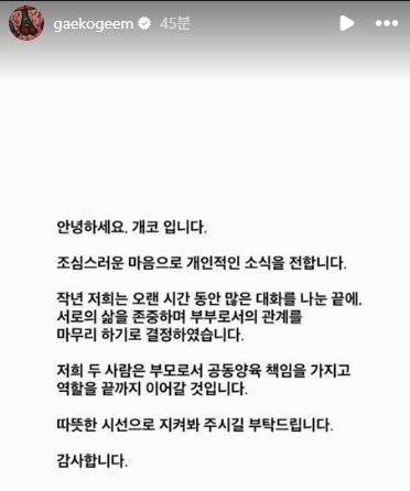 두 사람 사이에는 1남 1녀의 자녀가 있습니다. 개코는 부부의 인연은 끝났지만, "두 사람은 부모로서 공동양육 책임을 가지고 역할을 끝까지 이어갈 것"이라며 자녀들에 대한 애정과 책임감을 강조했습니다.